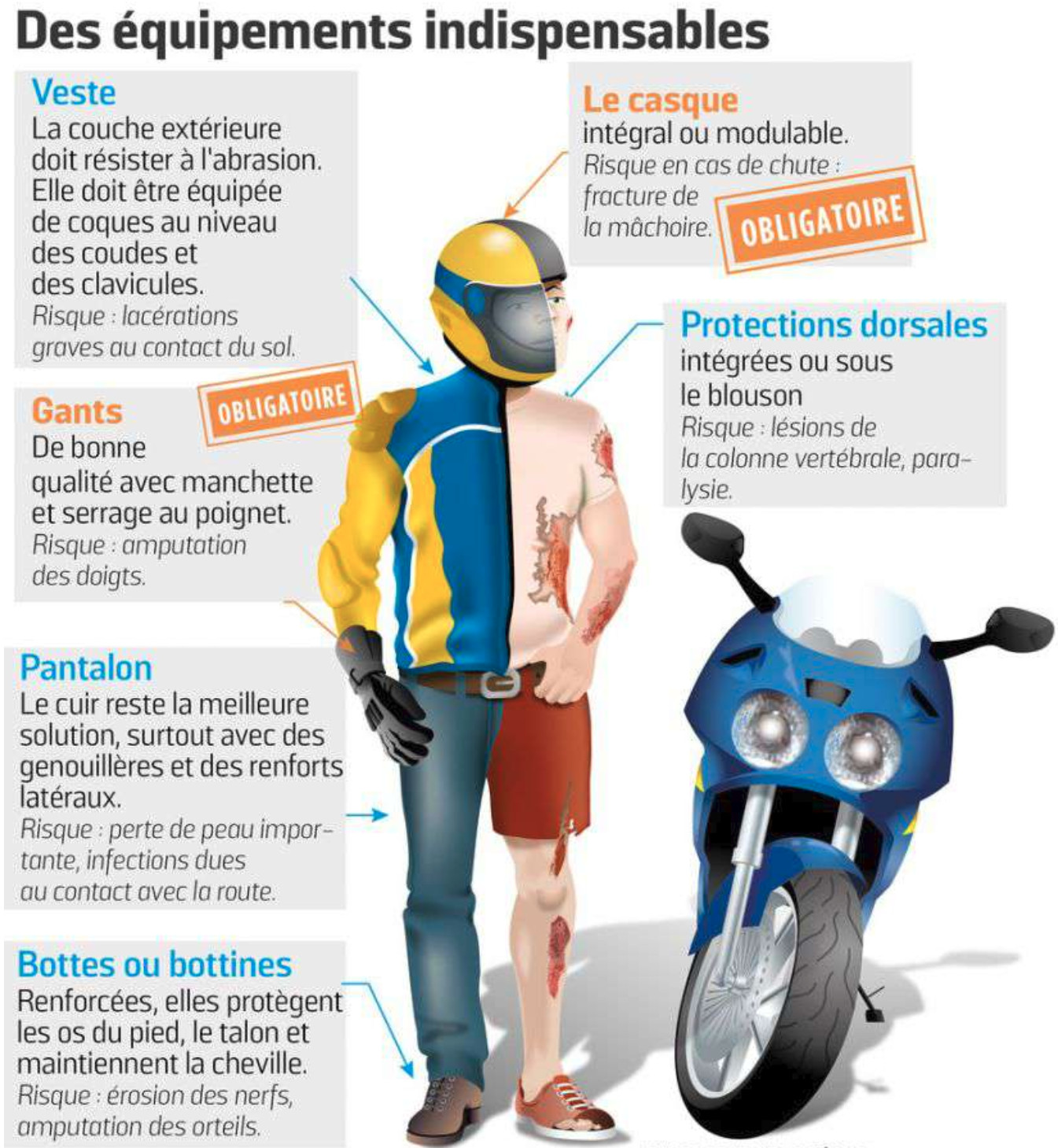 Etre un bon motard c’est aussi bien s’équiper. Alors que 70% des usagers de 2 roues sont déjà tombés au moins une fois, on retrouve en France 16% des scooters qui ne roulent sans aucun équipement de sécurité. Si en France la législation est en train d’évoluer avec l’obligation du gilet jaune, cette dernière est loin d’être aussi exigeante à comparé de certains de nos voisins comme la Belgique, il reste encore de nombreux progrès à faire. On distinguera dans cet article les équipements dits obligatoires de ceux que l’on vous conseille ardemment pour votre sécurité. On ne fait pas de la moto en tong, en short et en manche courte. C’est dit.